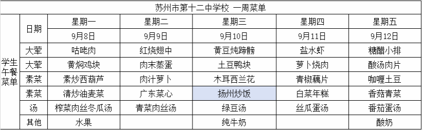 上一条:2025-2026学年第一学期苏州市第十二中学校第五周菜单