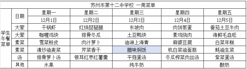 下一条:2025-2026学年第一学期苏州市第十二中学校第十三周菜单