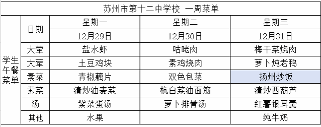 上一条:2025-2026学年第一学期苏州市第十二中学校第十九周菜单