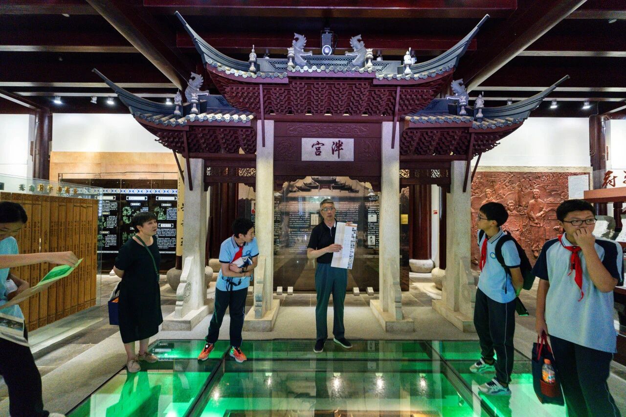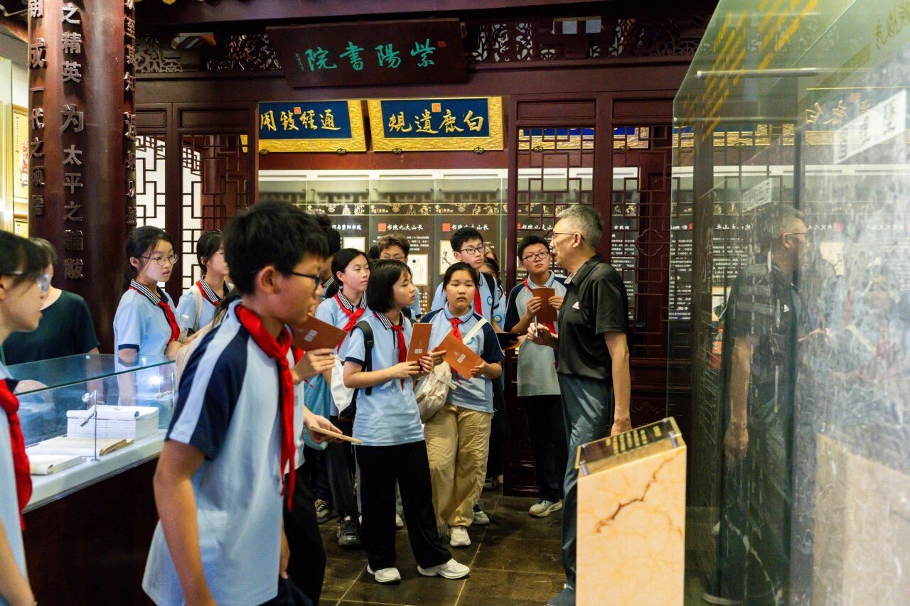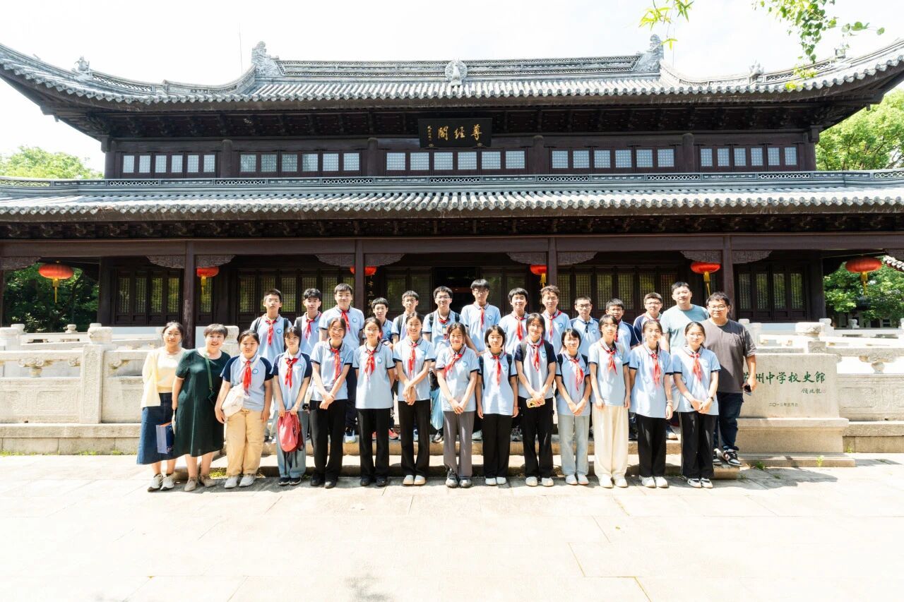同学们漫步林荫道开启苏州中学探秘之旅,丁校长亲切细致地为大家介绍校园各处的历史。同学们途经古朴的红楼与 “智德之门”,登上承载文化底蕴的道山,道山亭旁的五代柏尤为瞩目,历经千年风霜,见证着苏中的文脉传承。随后抵达尊经阁,这座始建于北宋、几经更名的建筑,无声地诉说着岁月故事。走进校史馆,精巧的现代校园模型率先映入眼帘,古今交融,别具韵味。“镇馆三宝”—— 清乾隆《三元诗》御碑拓片、北宋府学碑刻、一楼侧墙石碑,尽显历史厚重感;泛黄的珍贵经书、紫阳书院 六 首御诗,更是风雅十足。校友的革命事迹与院士成就展区,展现着苏中人才辈出的辉煌。