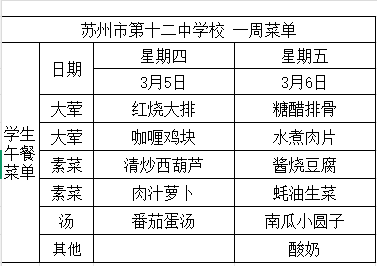 2025-2026学年第二学期苏州市第十二中学校第一周菜单